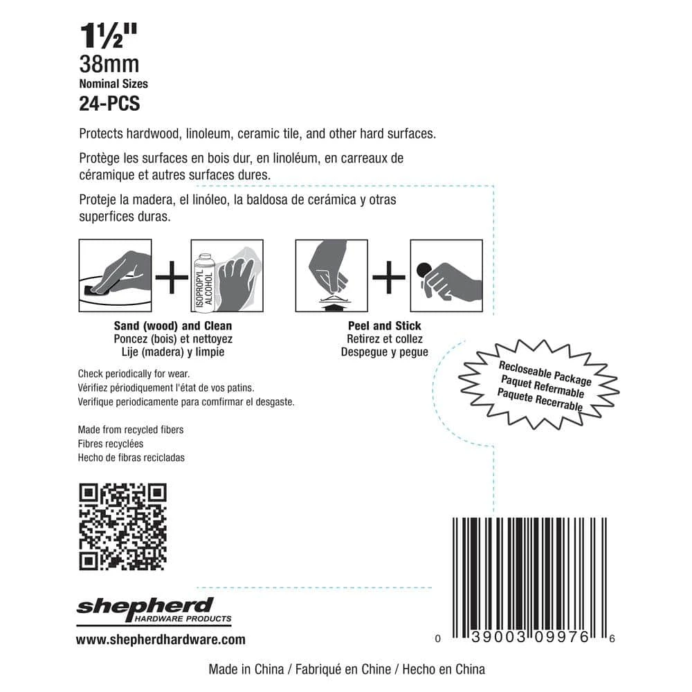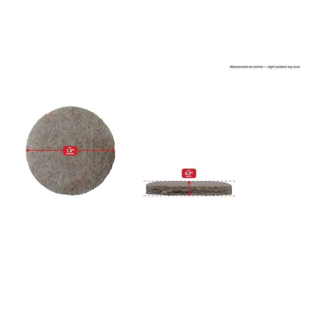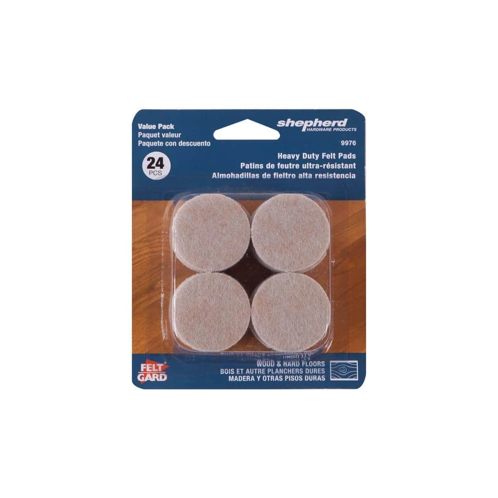 The Shepherd Hardware 1-1/2-inch FeltGard Self-Adhesive Felt Pads are designed to protect all of your household surfaces. These heavy duty felt pads prevent marring and scratching of furniture and floor surfaces such as hardwood, linoleum, vinyl and tile. They also reduce noise and friction while moving furniture across floor surfaces.
