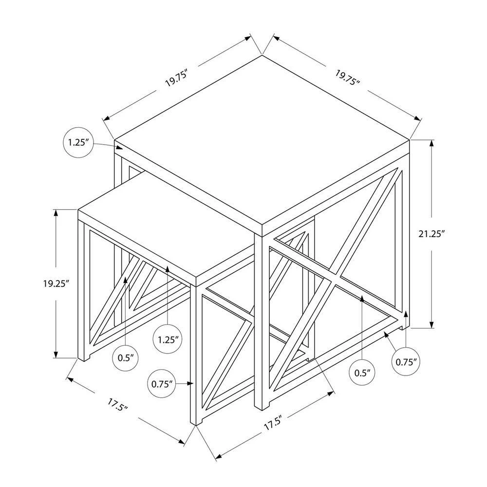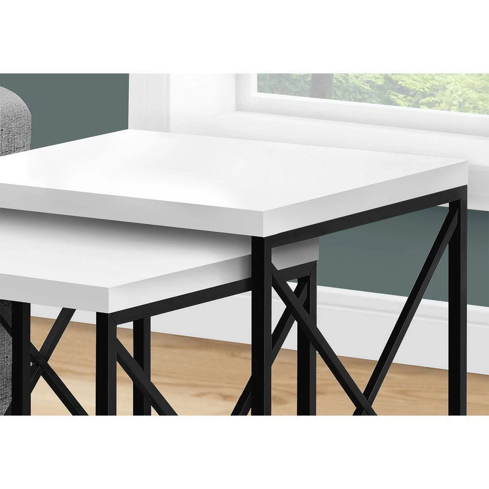 These Monarch Specialities Square Nesting Tables are a dynamic duo that delivers outstanding functionality and bold style. Versatile and portable, these accent tables can be used together in close proximity or separately in different areas. Placed side by side, they offer 2 ample surfaces on which to serve beverages and snacks when entertaining in your living room. If you temporarily need an extra table in another room, it’s easy to pick up and carry one of these lightweight tables. Next to a chair or sofa, these side tables offer convenient surfaces for a lamp and picture frames. When you no longer need full use of the smaller table, store it under the larger table to maximize space or keep it partially exposed to have a portion of the tabletop available for use. This set of 2 square end tables features a design that is robust and stylish. Both tabletops are 1.25-inches thick and are finished in a glossy white laminate. Supporting the thick tabletops are sturdy metal bases in a contrasting black finish for an industrial farmhouse look. The sides of the base are accented with an X design that brings a decorative flair.
