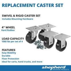 The Shepherd Hardware 2-1/8″ Soft-Tread Rubber Wheel Bed Frame Casters with Sockets (2-Pack) are ideal for use in homes, condos or apartments where storage space is limited. They lift beds up to 10″ to create storage space underneath and feature a 125 lb. load rating per caster. Their rubber wheels are great on wood floors and have brakes to keep a bed in place once moved. They also work well with caster cups to reduce bed movement.
