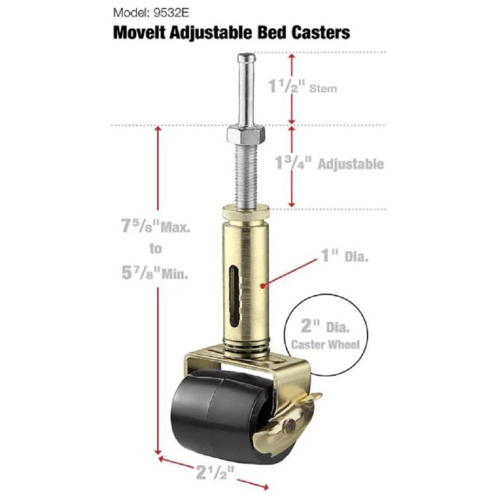 - Adjustable stem can be finger-tightened to dial in height with 1-3/4 inches of adjustability to raise a bed several inches above a standard bed caster, instantly creating usable storage space