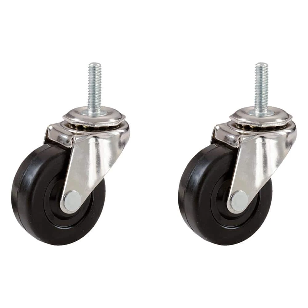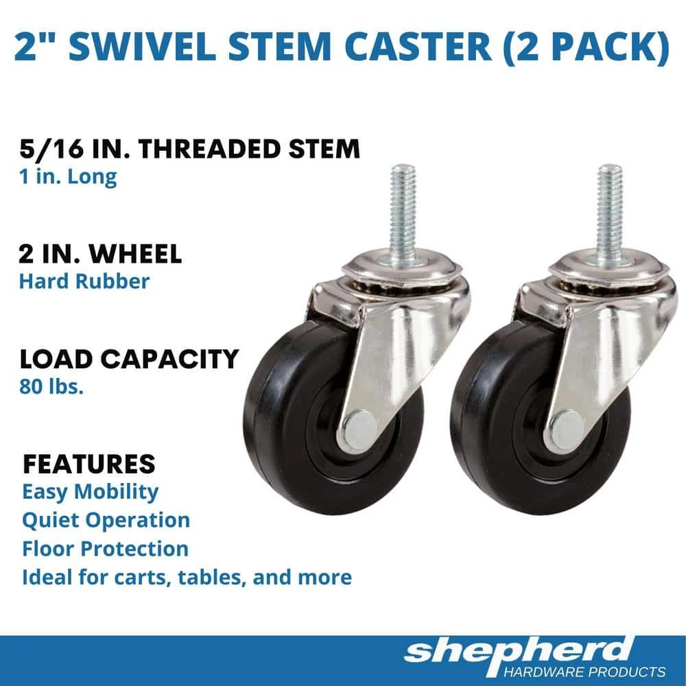 The Shepherd Hardware 2 inch medium duty threaded stem casters come with a double race rubber. Double ball bearing design assures easy swiveling. Ideal for carts, tables, and more.