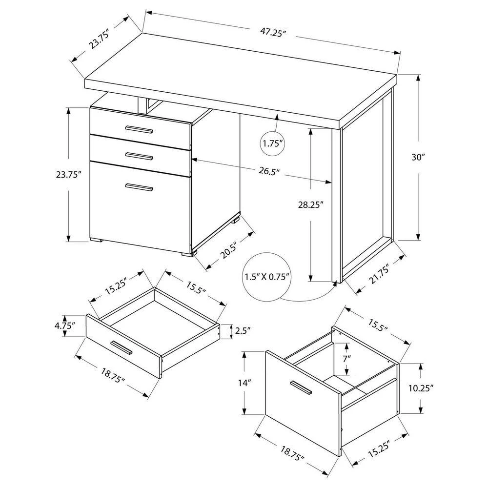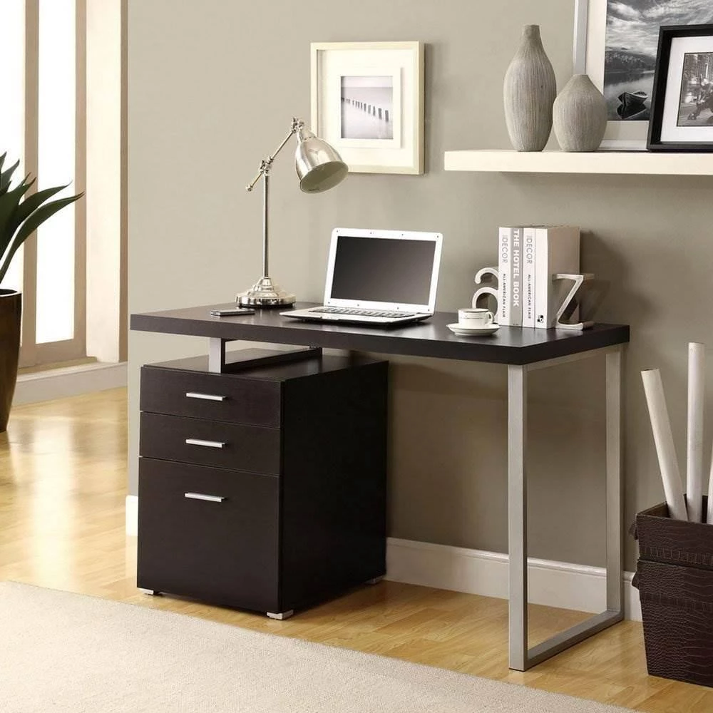 The perfect office needs the perfect desk to bring it all together and help you get your work done, which is where the Monarch Contemporary Cappuccino Computer Desk comes in. Sleek and modern, this desk features an attractive wood veneer dark taupe finish that looks great with a variety of contemporary, modern, and Art Deco styles.It can be assembled in either a right or left side configuration and comes with 2 drawers and a large file drawer to keep all your documents and supplies neat and organized. Get the most in both functionality and style in your study or office with the Monarch Contemporary Cappuccino Computer Desk.