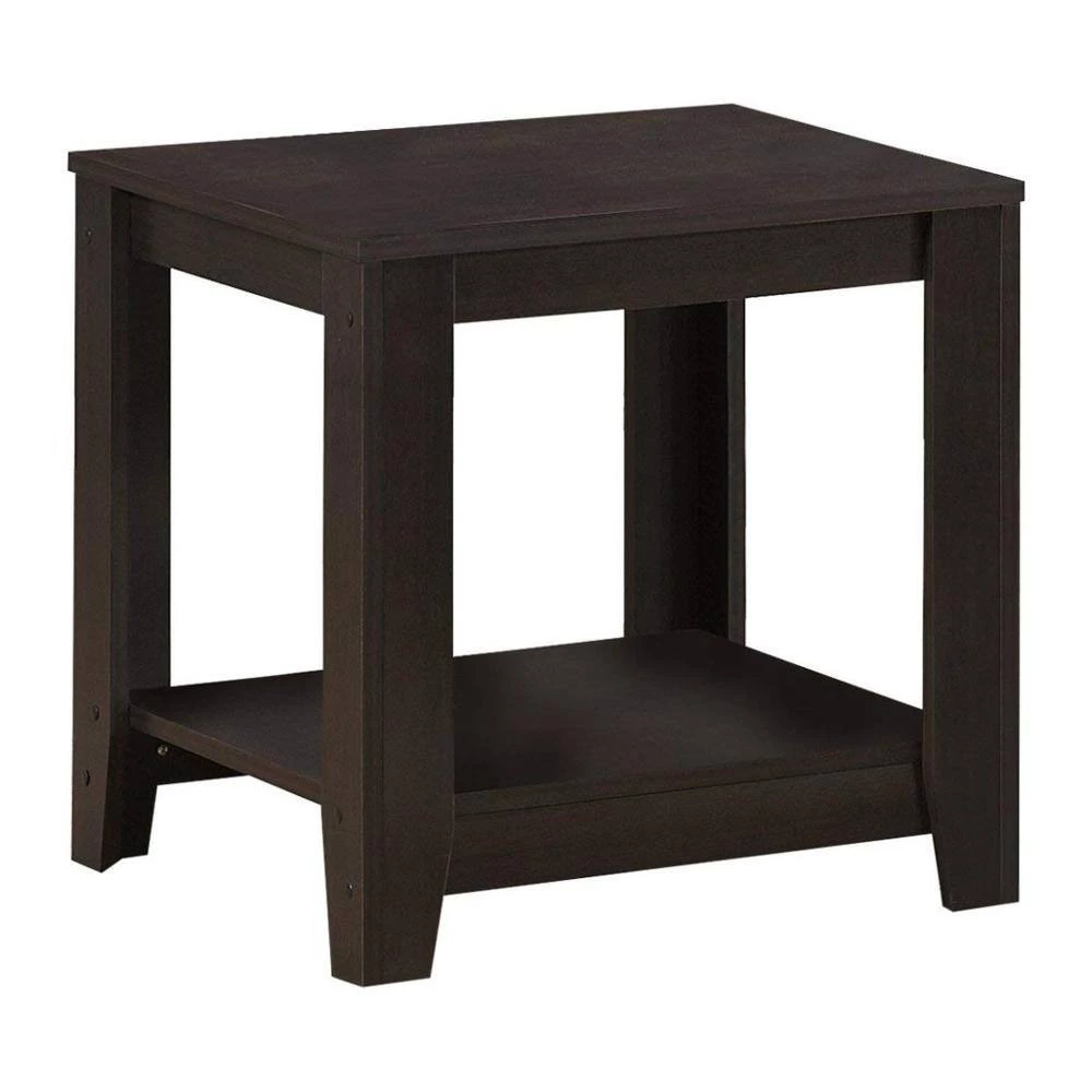 - Characterizing contemporary styling accurately with a dark brown wood look texture, this living room table set includes one coffee table and 2-end tables
