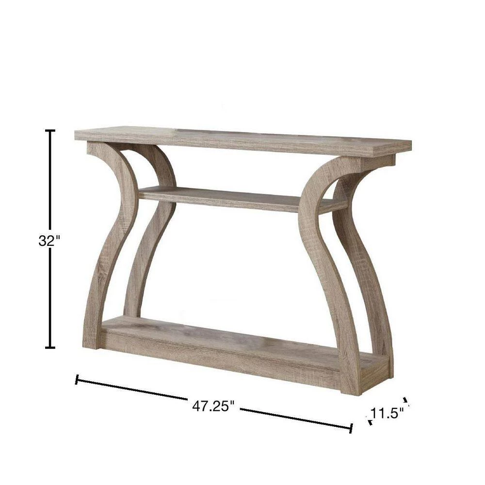 - 3-tiered shelf space, open concept design in an elegant dark taupe reclaimed-look finish