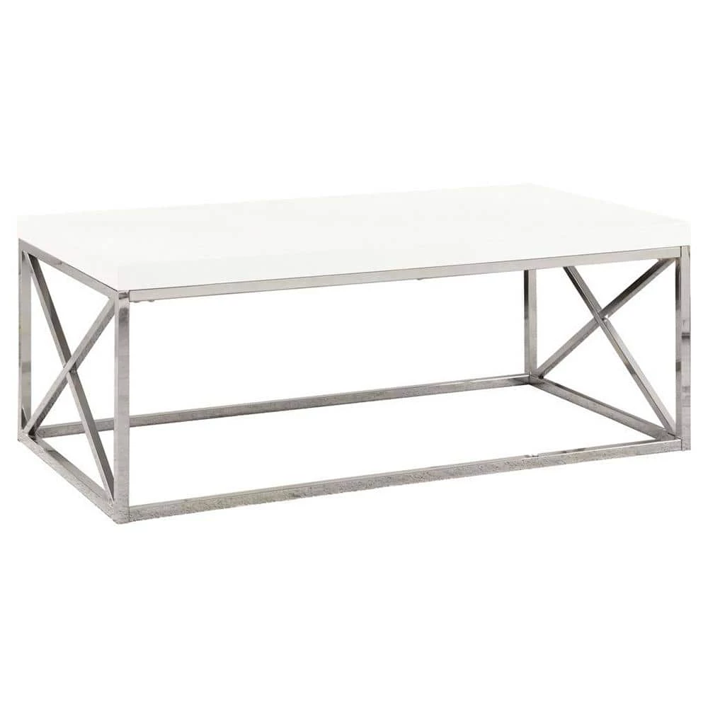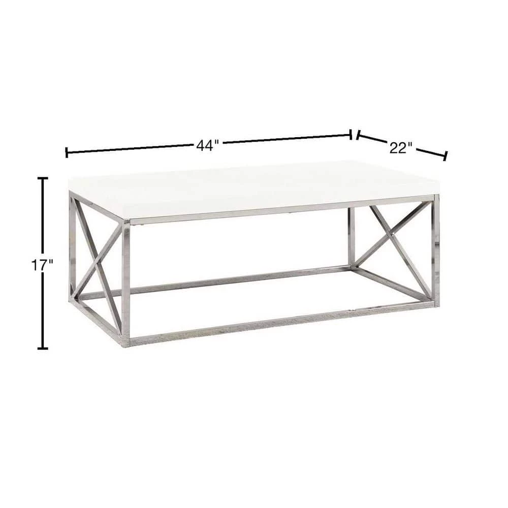 This Monarch Glossy White Chrome Metal Coffee Table is bad and boujee. Contemporary with a hint of modern vibes, this table is the missing piece in your furniture collection. It boasts a white glossy finish, a chrome base, and it provides you with plenty of room for your magazines, vanilla latte, and your late night din takeout order. The thick, rectangular top is smooth as butter and easy to clean in case the natural spills in life happen. It can hold up to 132 lbs. and looks stunning next to your stylish couch and other pieces. You’re about to feel a whole lot of modern love with this Monarch Glossy White Chrome Metal Contemporary Coffee Table.