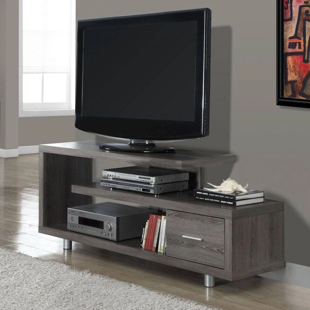 Give your TV the best seat in the house with a TV stand that gives your space the perfect blend of form and function with the Monarch 60 in. Modern Dark Taupe TV Stand (2-Pack)With thick and study wood panel construction and a aged wood, dark taupe finish, this entertainment center goes with a variety of contemporary, modern and Art Deco stylings. Wide enough for 2 leg TVs up to 47 in. or all center stand TVs, this stand is the perfect spot to perch your flat screen in the living room, family room or den. It also features sturdy metal legs, built-in shelving and a handy drawer for storage. Complete your living room space and give your TV that final touch with the Monarch 60 in. Modern Dark Taupe TV Stand (2-Pack).