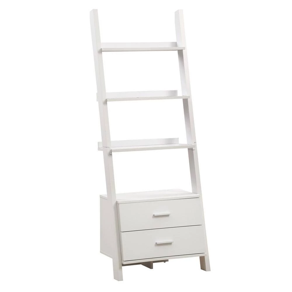 Who can resist this 69 in. high ladder bookcase, With two storage drawers accented with sleek silver toned handles, this bookcase is both unique and practical. Its exquisite symmetry adds style to any room and with its 4 graduating open shelves there is ample room to display pictures, decorative pieces and even books. Showcase this white finished ladder bookcase in your home today.