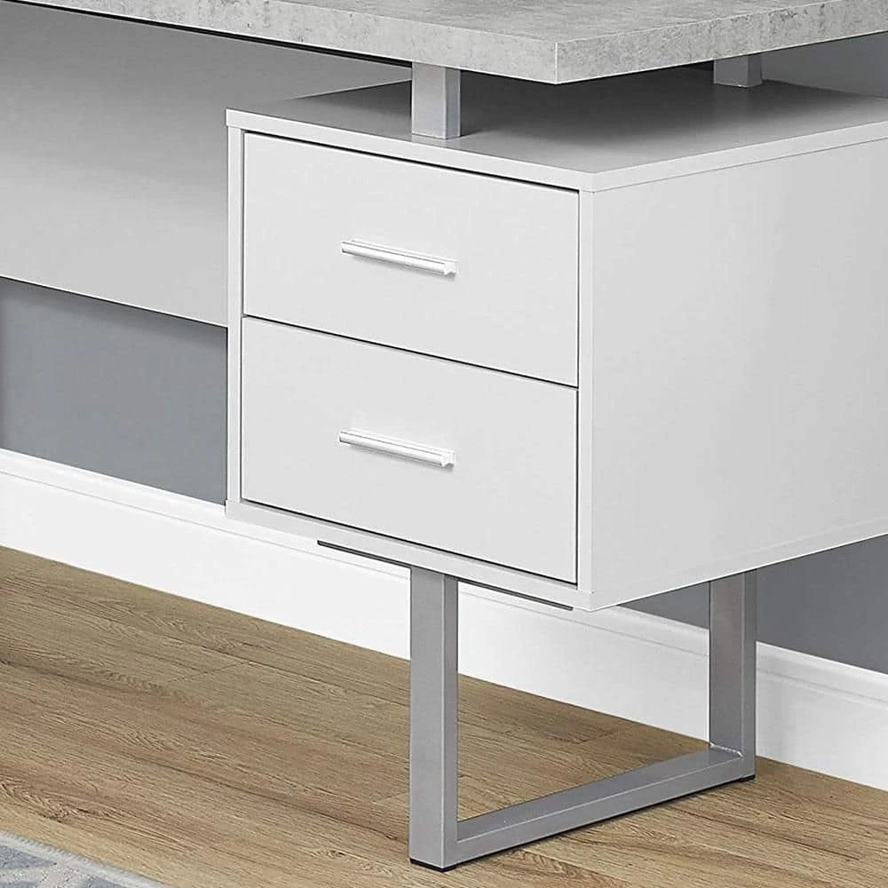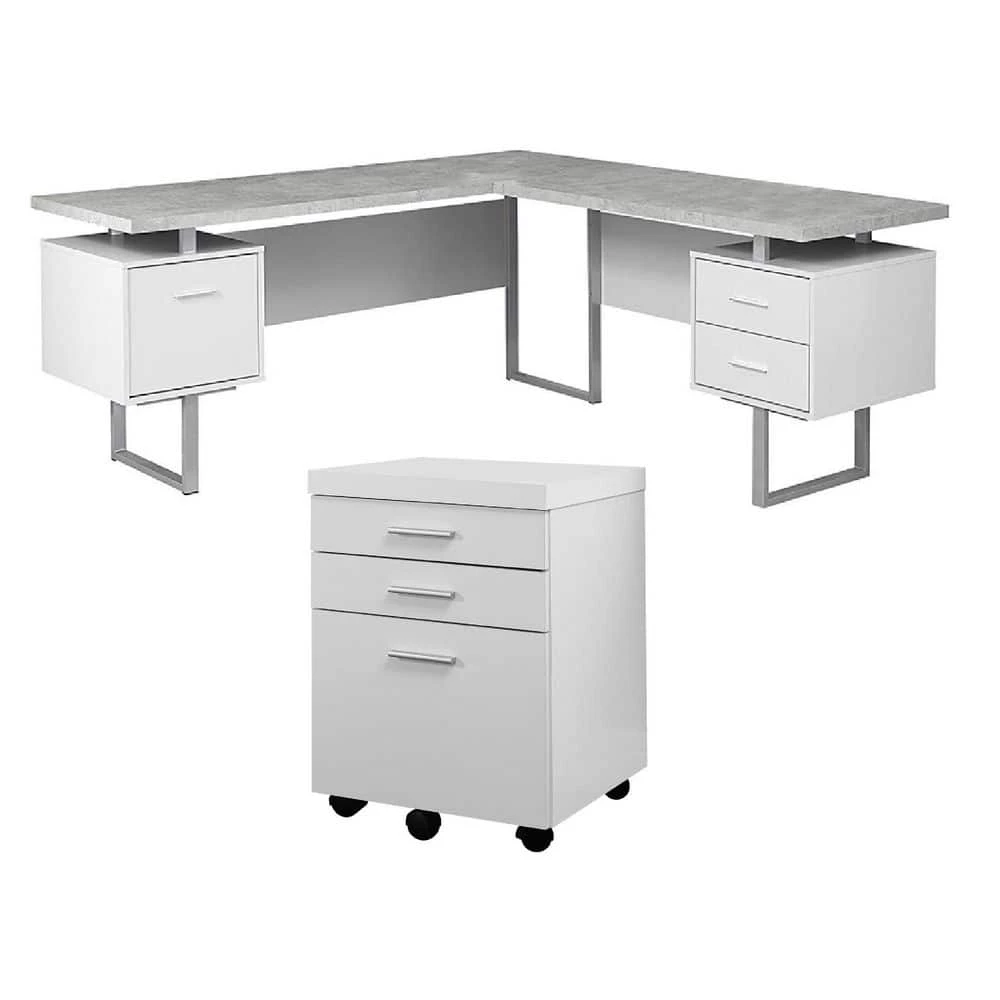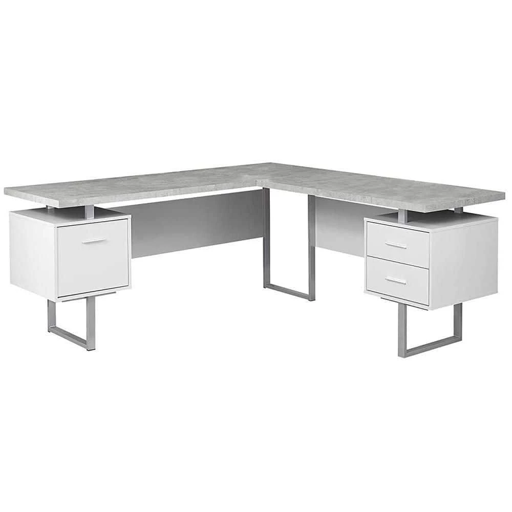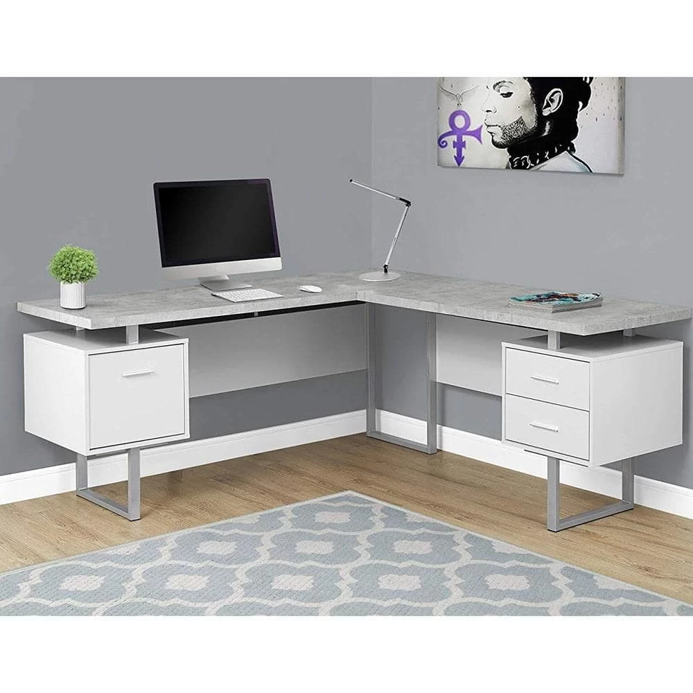 The perfect office needs the perfect desk to bring it all together and help you get your work done, which is where the Monarch Specialties 70 in. Computer Desk and 3-drawer filing cabinet come in. Sleek and modern, this desk and filing cabinet feature an attractive cement-look gray 2-tone finish on the top that looks great with a variety of contemporary, modern and art deco styles. The desk can be assembled in either a right or left side configuration and comes with 2-drawers and 1 large file drawer to keep all your documents and supplies neat and organized. This L-shaped desk is a must-have for any home office. Put the extra in extraordinary with the filing cabinet on 5 casters. Accented with simple modern silver colored handles, the top 2-drawers are useful for files, papers, books while the bottom drawer can fit standard or legal sized hanging folders.