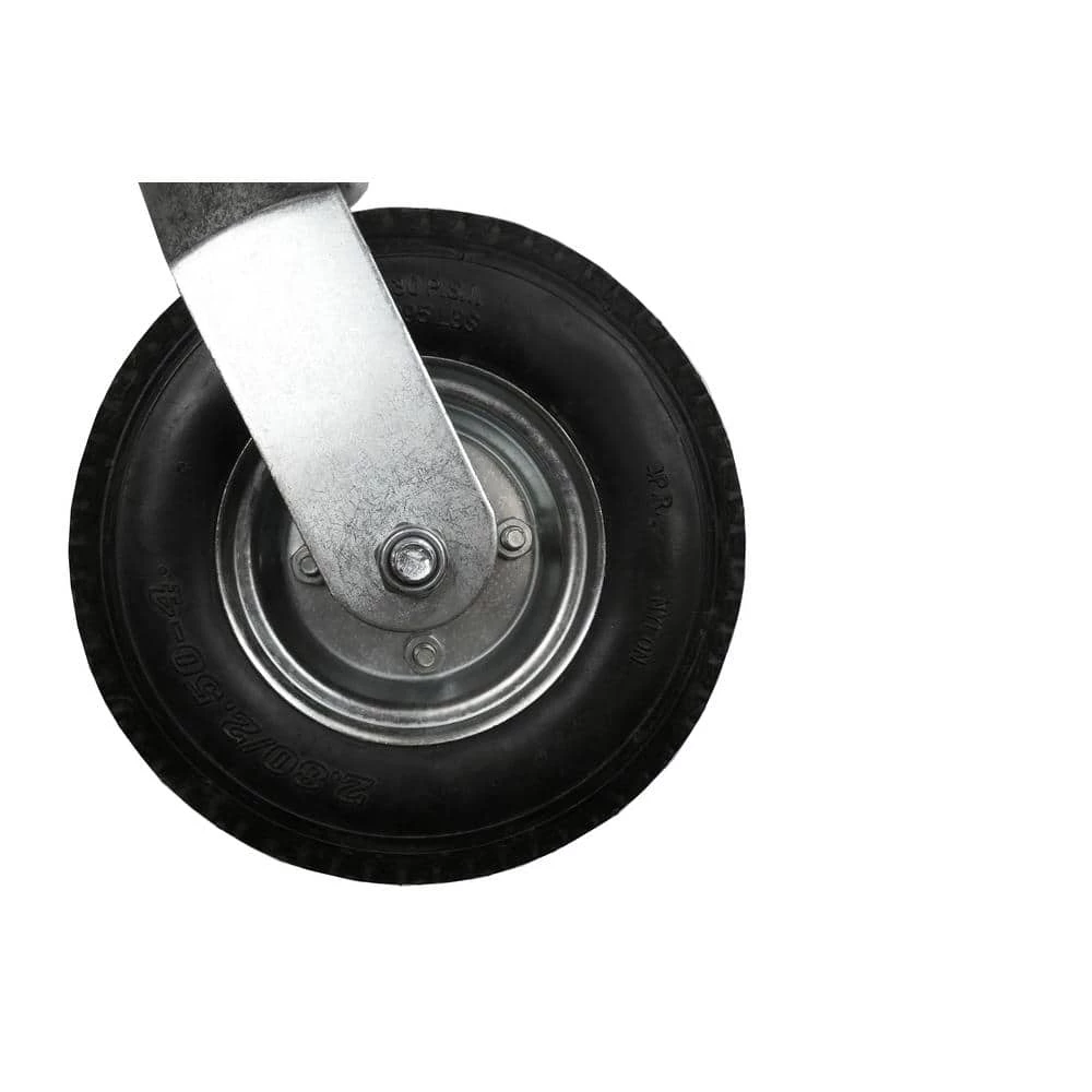 - 8 inch diameter black air-filled pneumatic rubber tire on steel hub with 360-degree swivel and universal mount