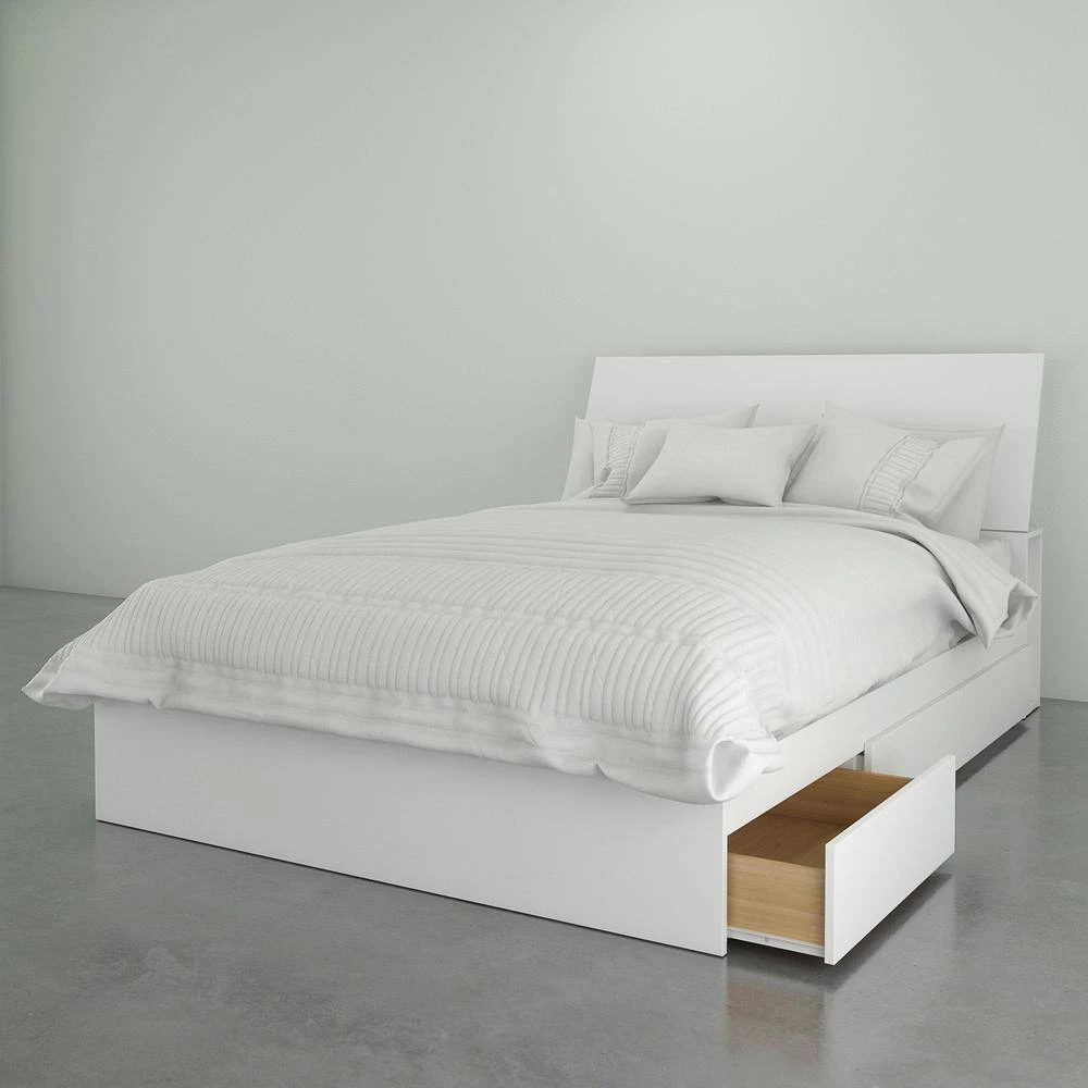 This Full Size 3-Drawer Storage bed offers 3 convenient drawers, ideal to store away beddings, clothes, toys, books without taking any extra square footage. It’s also entirely reversible, so you can decide on which side of the bed you prefer having the 3 drawers. This bed frame features a unique metal and hardwood slat construction allowing for easy assembly, sturdy construction and easier handling. Nexera Full Size Panel Headboard in white features lateral storage spaces on each side, ideal to keep your favorite books and magazines handy. This headboard is not compatible with metal bed frames. Perfectly matches various full size beds from Nexera (sold separately).