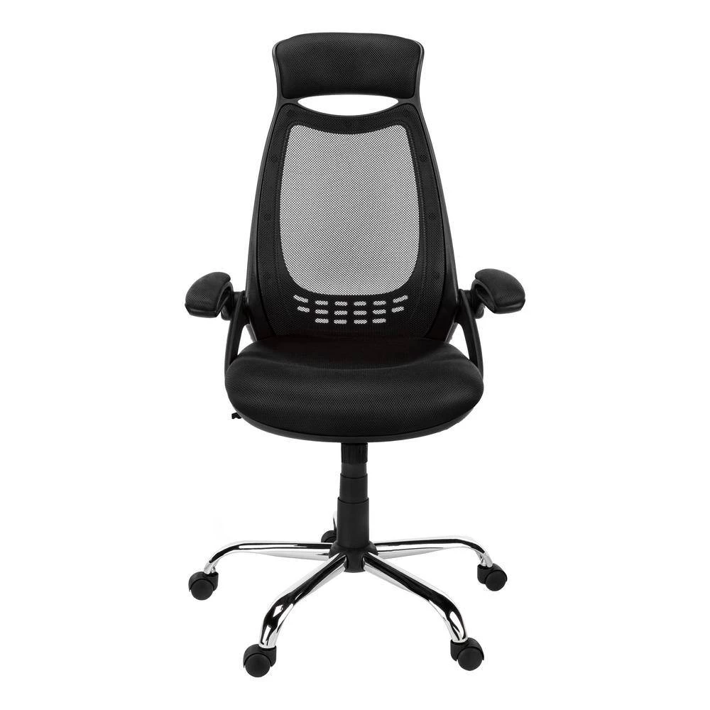Elevate your office space with this modern ergonomically designed high-back executive office chair in a classic black finish. BIFMA certified for commercial or home office use, this on-trend designed chair is not only fashionable but supremely comfortable with a natural curved padded back, head rest, and arm rests that swing back, along with a thick cushioned seat all upholstered in a durable and breathable commercial grade nylon mesh fabric. The convenient side lever allows you to easily adjust the seat height between 19.5 in. – 23 in. with a free/lock-in tilt back mechanism to recline for added comfort. The 5 nylon hooded castors on a sturdy chrome base give a smooth movement across the floor or low pile carpet. Easy to assemble, you deserve to be sitting comfortably and in style as you work hard to close those deals.