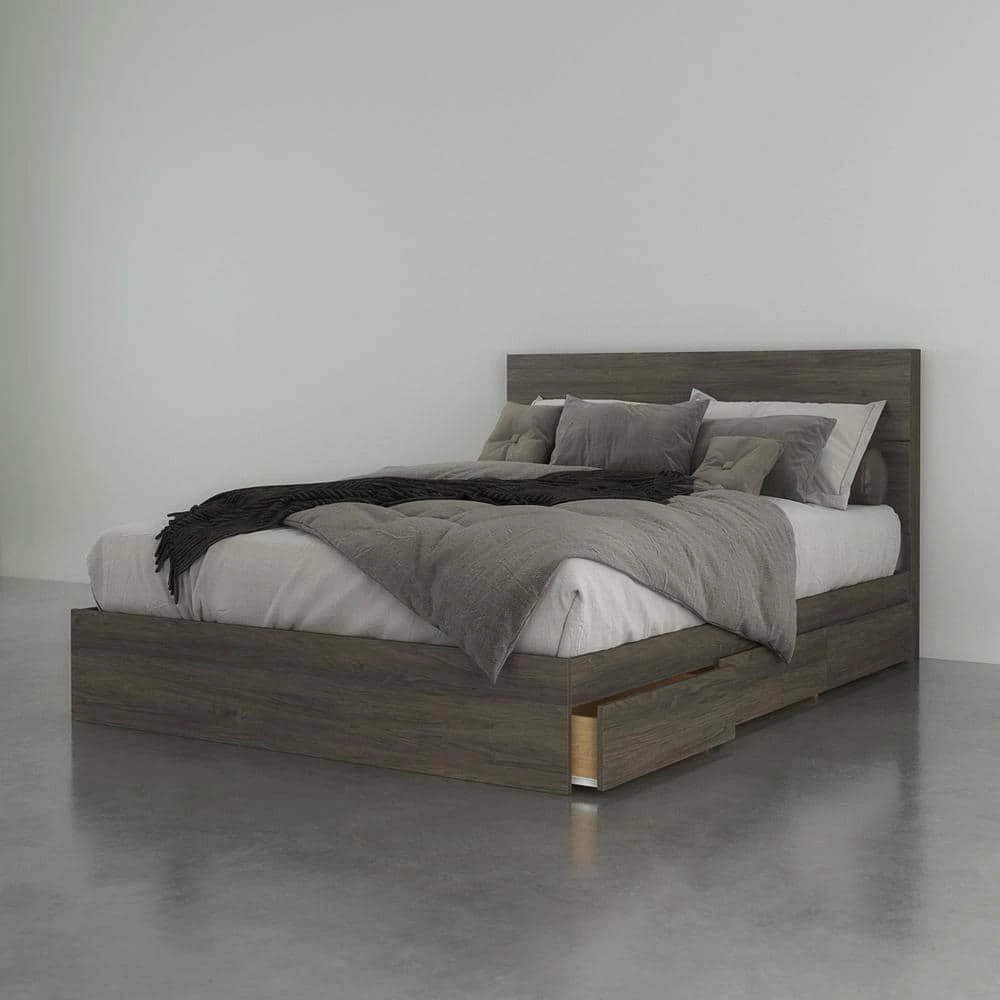 This Queen Size 3-Drawer Storage bed offers 3 convenient drawers, ideal to store away beddings, clothes, toys, books without taking any extra square footage. It’s also entirely reversible, so you can decide on which side of the bed you prefer having the 3 drawers. This bed frame features a unique metal and hardwood slat construction allowing for easy assembly, sturdy construction and easier handling. Nexera Queen Size Panel Headboard in Bark Grey is the perfect addition to your Nexera bed that will complete the look of your room and add personality. Offered in a rich Bark Grey finish, it’s characterized by its simple assembly steps and sleek trendy style.
