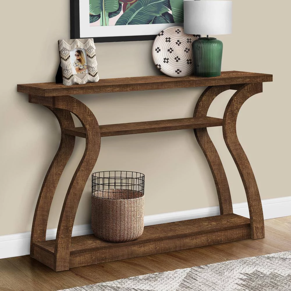 Proudly display family photos, vacation memories, and beloved trinkets for all to see on the Monarch Specialties Stylish Accent Table.Perfect for home entryways, hallways, living rooms, and more, grab your guests’ attention with this functional and trendy console table. Store books, framed photos, flowers, and more on this large surface table.This functional hallway table features a unique curved base.with a 3-tiered open concept design so you have plenty of surface space to show off a few of your favorite things. The slim and sleek design allows this stylish table to easily fit in small homes, condos, dorms, and apartments. Measuring 47.25 inches long, 11.5 in. Wide, and 32 in.tall, the Monarch Specialties Home Entryway Wooden Accent Table is both functional and stylish.Whether you place the console table near your front door or in the guest bedroom, your home visitors are sure to notice.