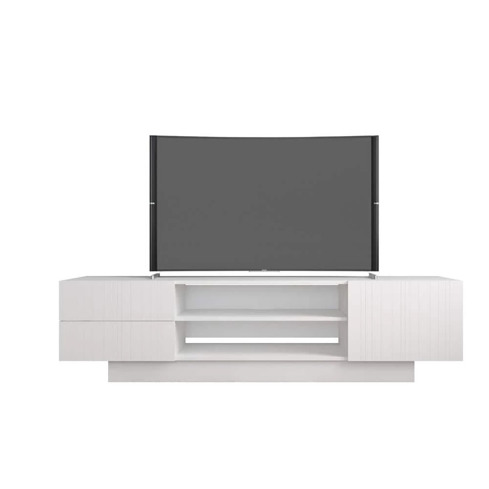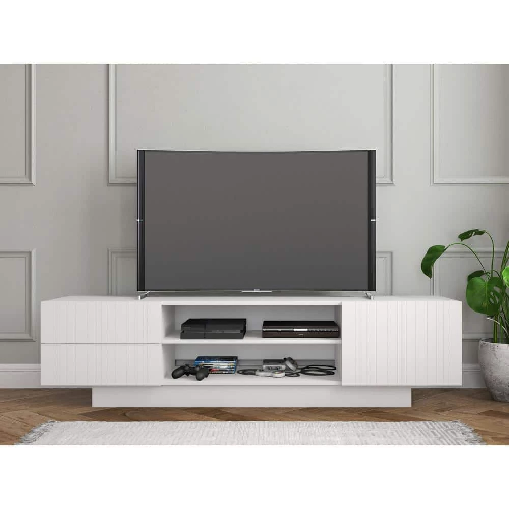 Ideal for movie marathon essentials or for your favorite potted plants, this TV stand with its modern yet cozy look is the perfect addition to your trendy & minimalist living room. This Marble collection 72” TV stand offers open shelf areas, 2 drawers and a door with additional storage space. The door panels have a modern twist with a linear construction detail that brings timeless depth and texture in a matte white lacquer finish.