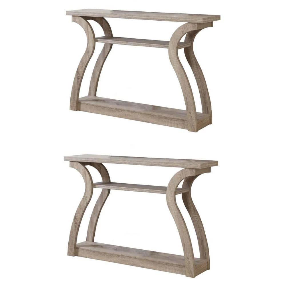 Spruce up your hallway and add a touch of elegance to your home with the Monarch 3 Tier Wood Dark Taupe Console Accent Table. This open concept design, unique curved console table gives you 3 tiers of storage for your decorations or for stashing a key bowl. It’s made with sturdy engineered wood and finished in a dark taupe color and reclaimed wood finish that complements any home decor. It’s so sturdy, it can hold up to 18 pounds on each shelf. This accent end table is CARB compliant and takes only 30 minutes to assemble.