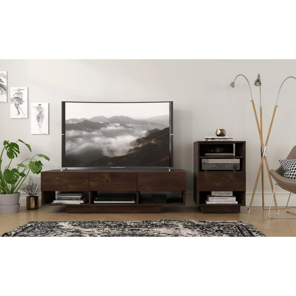 Stereo Collection from Nexera is a trendy and easy to live entertainment collection offered in Truffle melamine finish. Stereo 60-inch TV stand features 3 storage drawers and 3 open spaces for your electronic components; these 3 bottom cubbies are also opened at the back to facilitate wire access and optimize air flow. The Stereo TV Stand can be paired with Stereo Audio Cabinet for a complete home entertainment set.